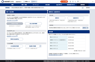 業務管理ページで は、車両取引計算書や支払延長サービスの申し込み、書類の到着状況の確認機能を網羅。複数台の車両を仕入れる方や会場をまたがって落札される方の作業工数を大幅に削減します!